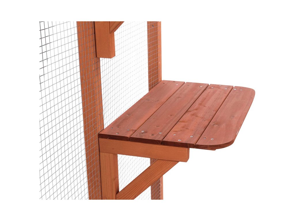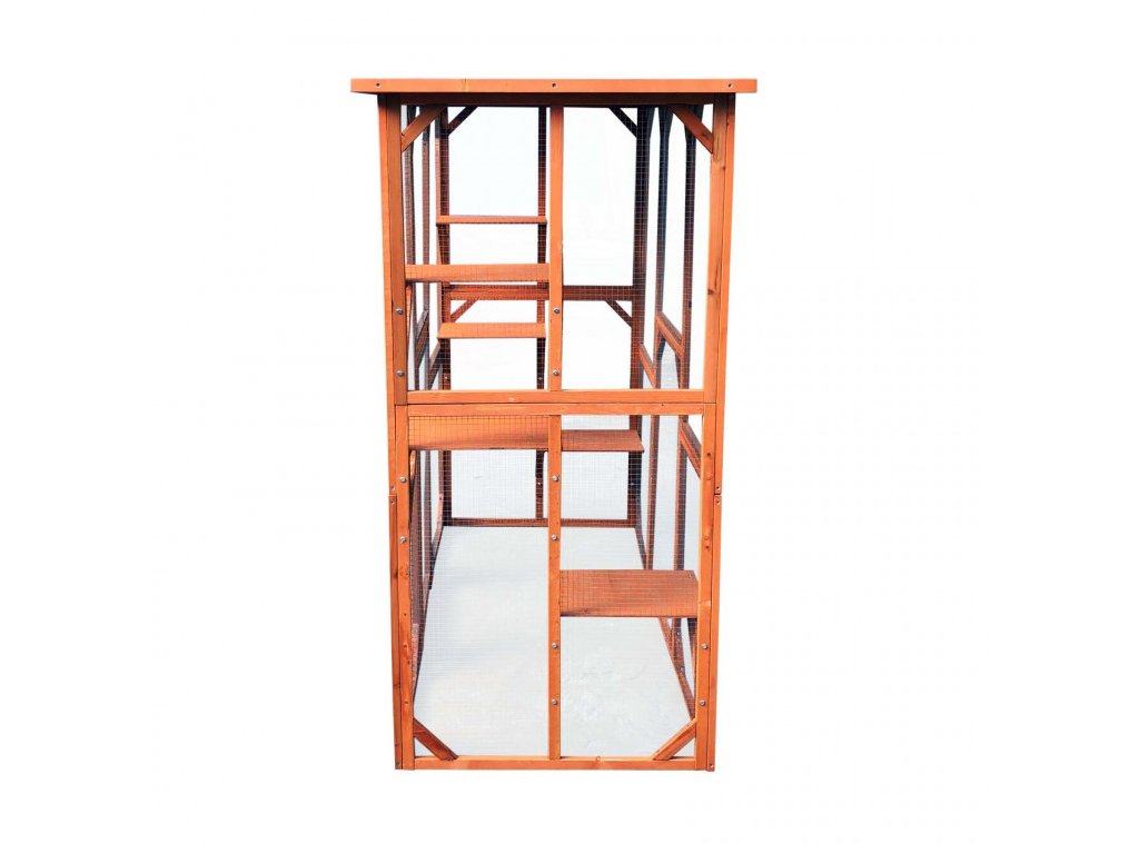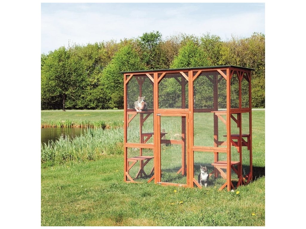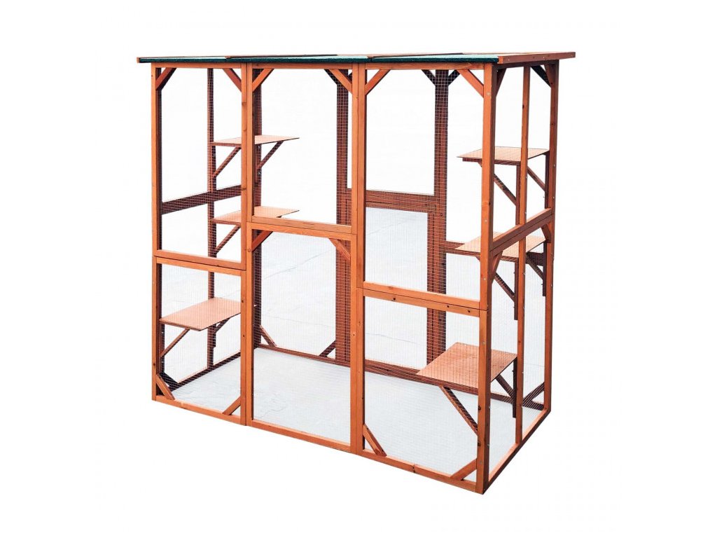 Tento praktický vonkajší výbeh umožňuje vašim domácim mačkám pobehovať na čerstvom vzduchu bez rizika úteku. So svojimi priestrannými rozmermi 180 x 88 x 169 cm je výbeh vhodný najmä na inštaláciu na záhrade, dvore alebo terase. Výbeh je vyrobený z jedľového dreva s vodoodpudivou úpravou s pevným drôteným pletivom z pozinkovanej ocele a strechou odolnou proti poveternostným vplyvom s bitúmenovým náterom, takže ani dážď, sneh a silné slnečné žiarenie nie je problém. Výbeh má šesť ležadiel, z ktorých môžu Vaše mačky pozorovať okolie a relaxovať. Vďaka predvŕtaným otvorom a presnému montážnemu návodu je možné výbeh zostaviť rýchlo a ľahko. Výbeh má tiež dvierka, ktoré je možné zamknúť zvonku.