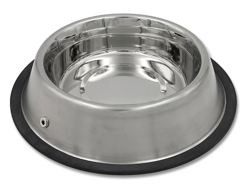 Vyhrievaná miska pre psov proti zamŕzaniu pitnej vody, nerezová, s objemom 1,8 l, s protišmykovým gumovým lemom, s príkonom 15 W a napätím 12 V, napájací kábel v ochrannom kryte, trieda ochrany proti vode IP 65.