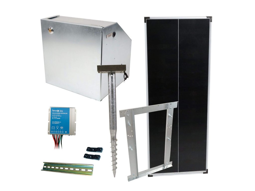 Systém pre solárne nabíjanie batérie zdroja elektrického ohradníka. Súprava neobsahuje generátor a batériu. Batériu a vhodný generátor s kombinovaným napájaním treba dokúpiť.