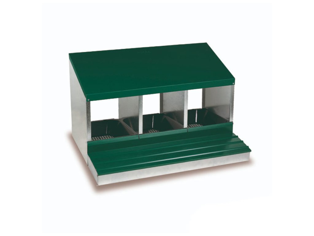 Hniezdo má spádované dno, čo zaisťuje, že vajcia sa samy odkotúlia do zberného košíka. Tým pádom si môžete jednoducho odobrať čisté a nepoškodené vajcia. Montáž hniezda na stenu je jednoduchá pomocou skrutiek, a pri potrebe ho možno jednoducho sňať zo steny na účely čistenia. Možnosť aj varianty na nožičkách. Jedná sa o vylepšený model s kovovými vekami znáškového hniezda.
